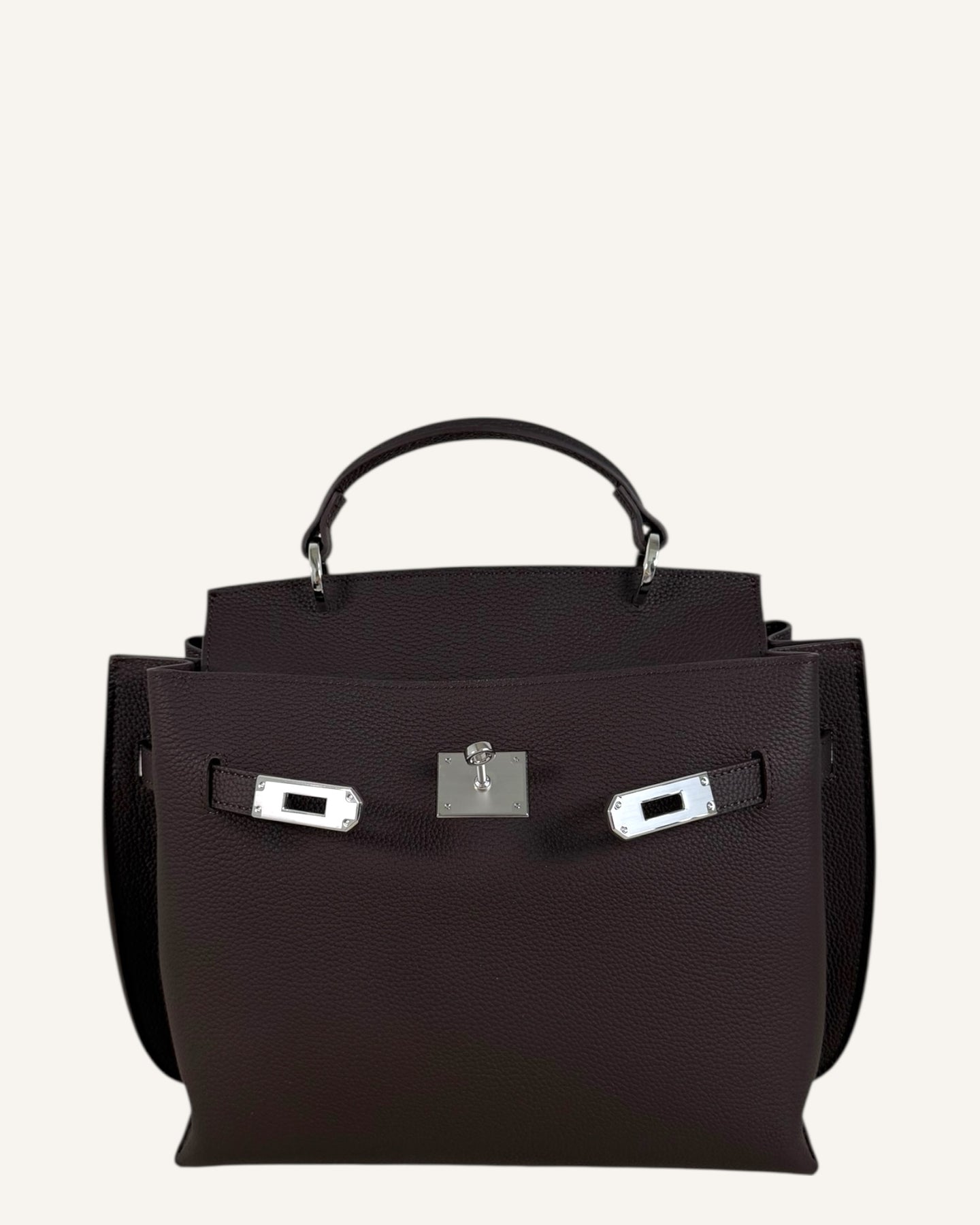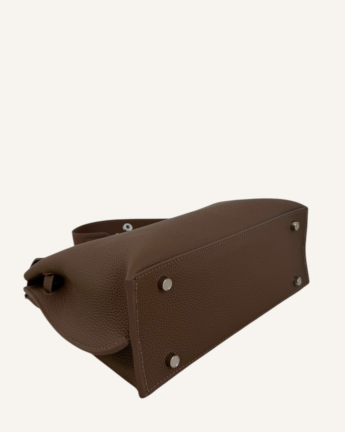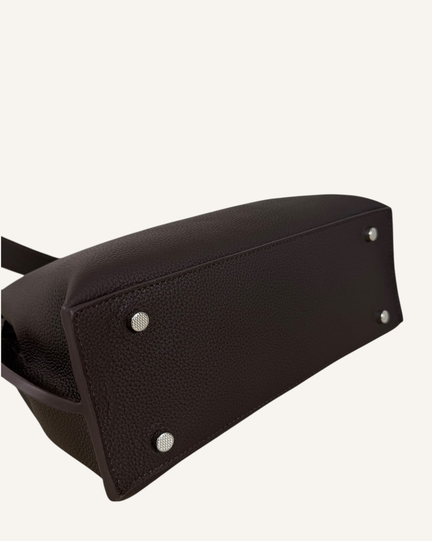 Made from 100% full-grain leather with precise stitching and a suede lining, it is built to last. The material is neither too soft, allowing the bag to keep its shape and stand up on its own whether full or empty, nor too rigid to be comfortable for carrying.
