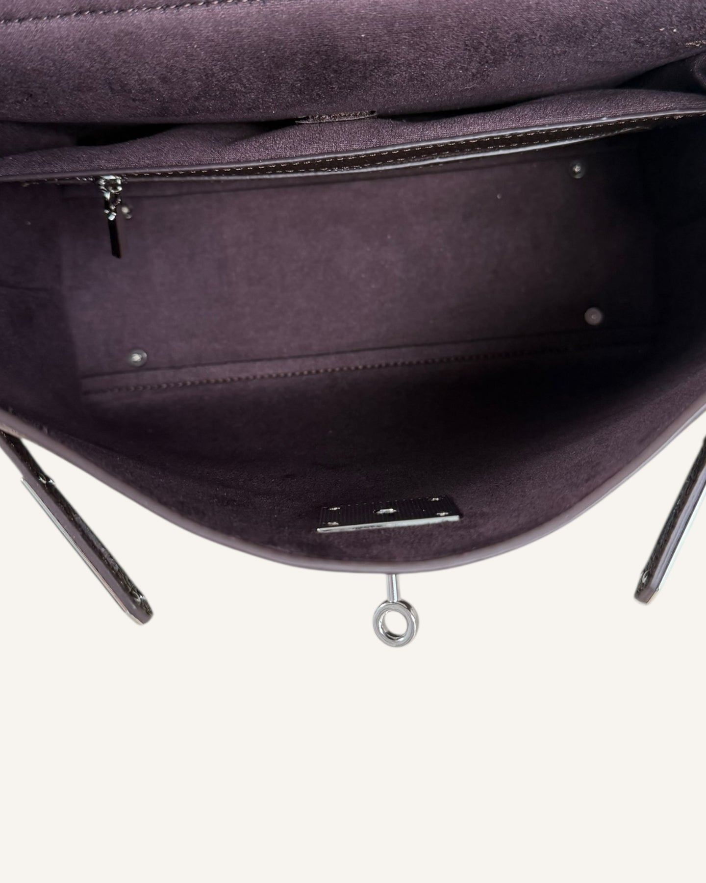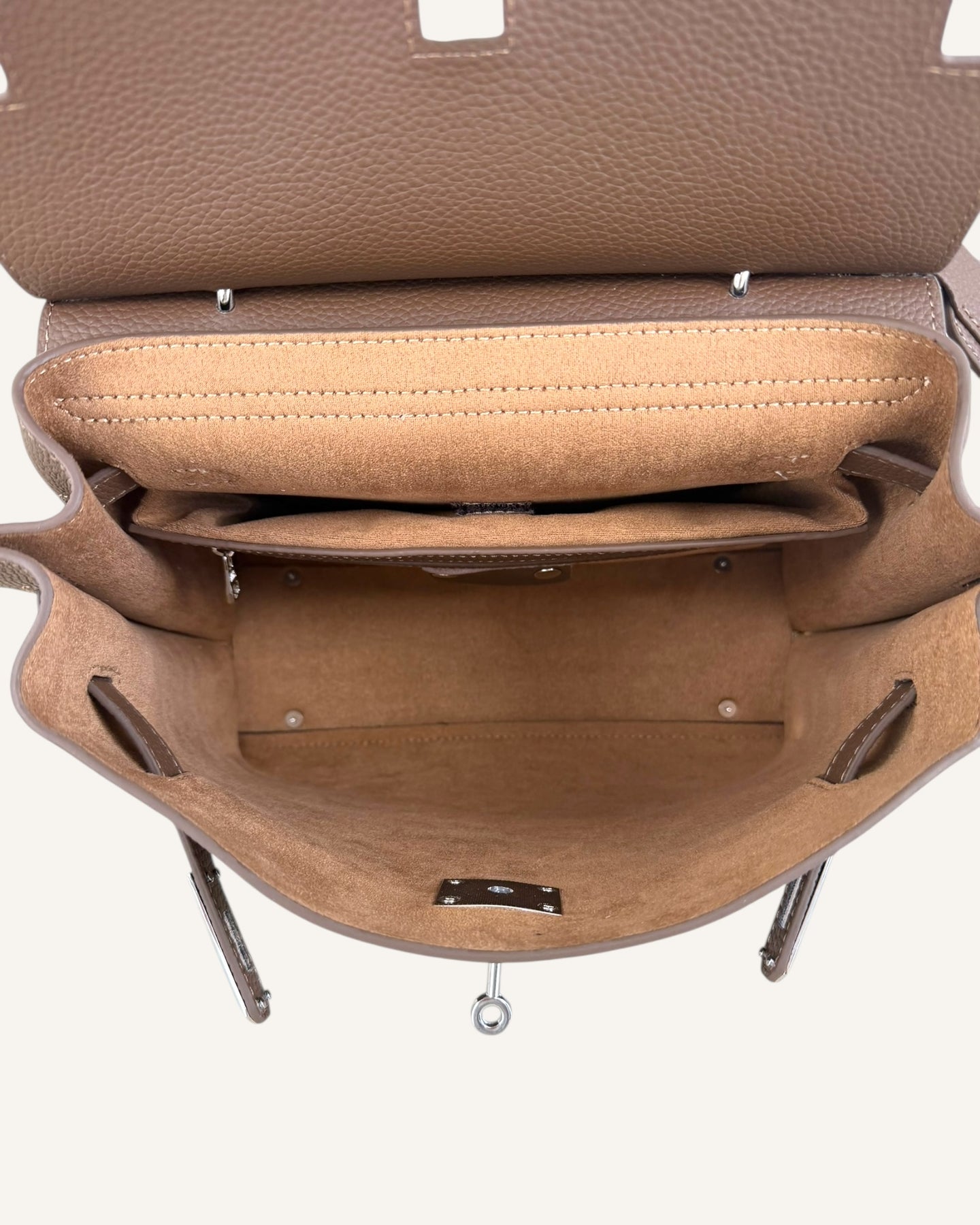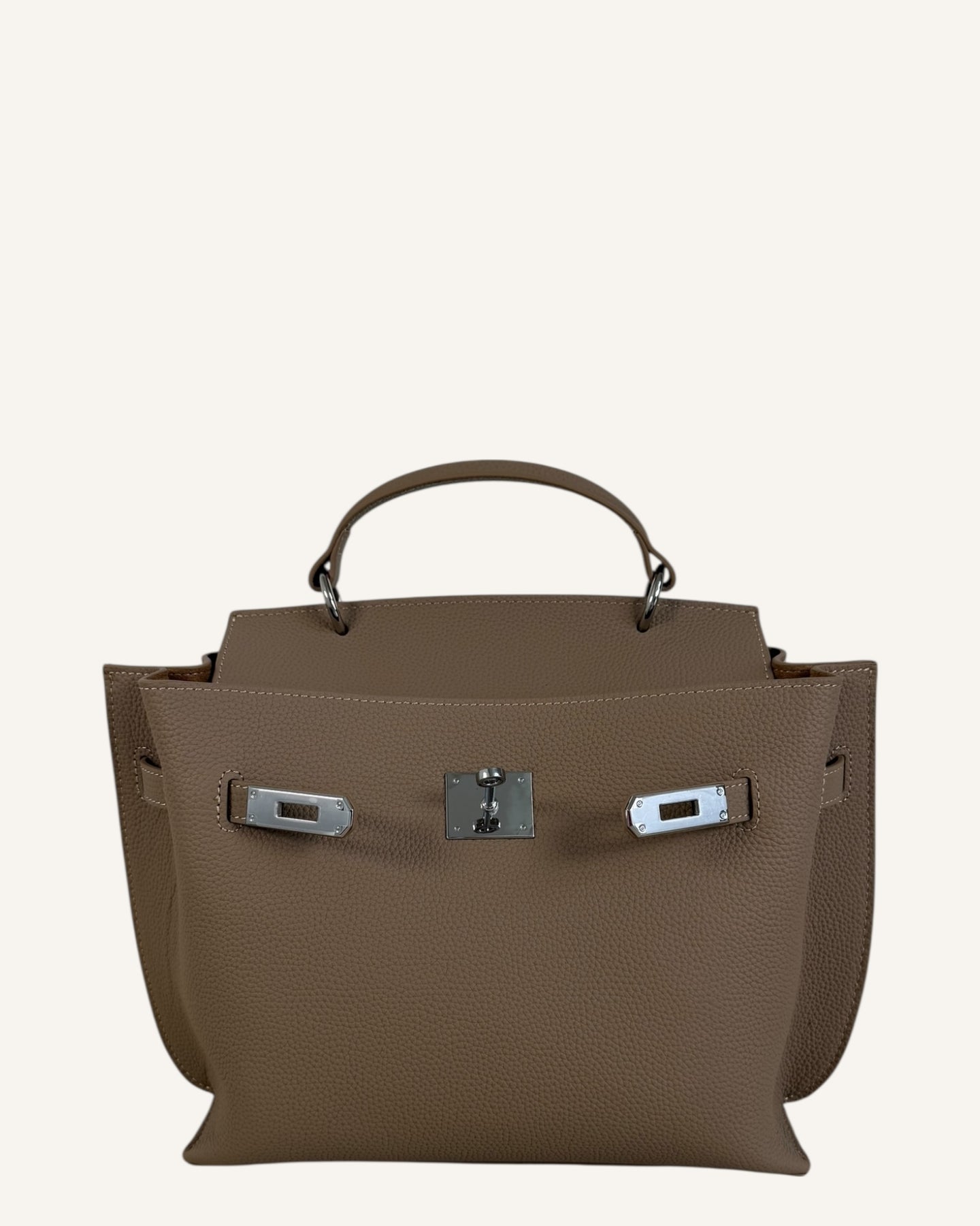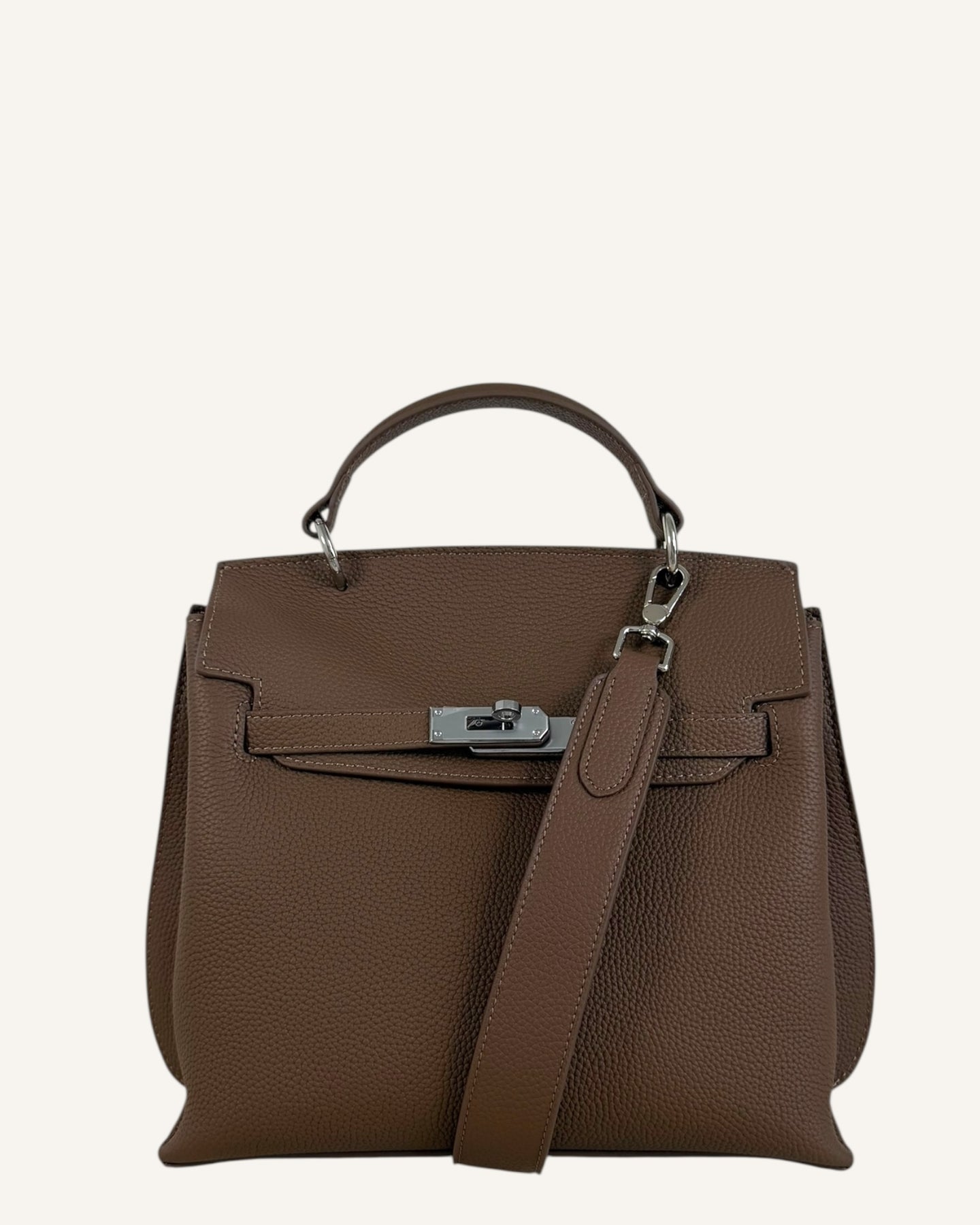 Made from 100% full-grain leather with precise stitching and a suede lining, it is built to last. The material is neither too soft, allowing the bag to keep its shape and stand up on its own whether full or empty, nor too rigid to be comfortable for carrying.